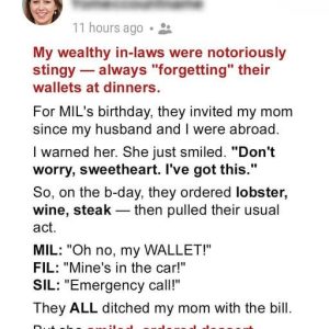 For years, my wealthy in-laws had a strange habit: they’d “forget” their wallets at restaurants, leaving others to pick up their lavish bills. I’d warned my husband,…